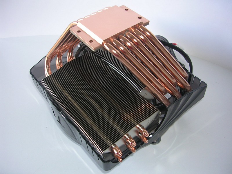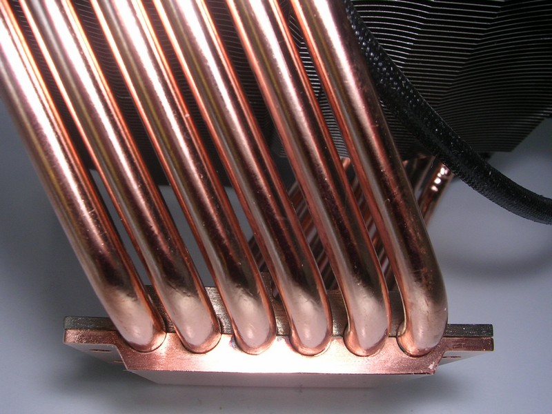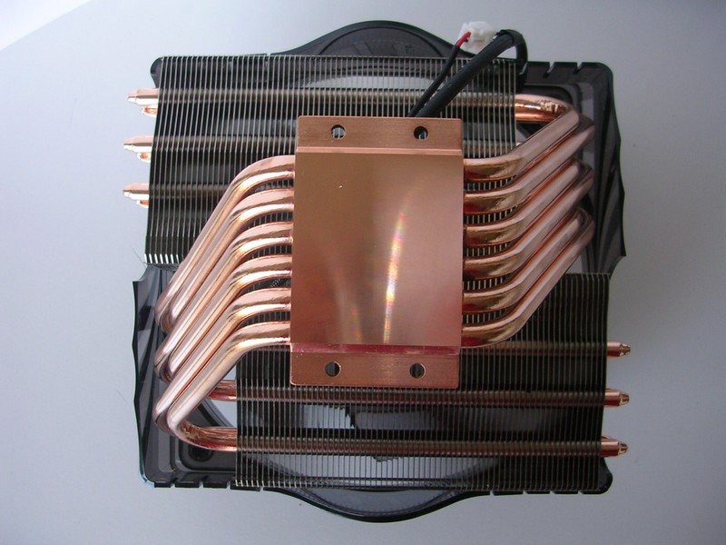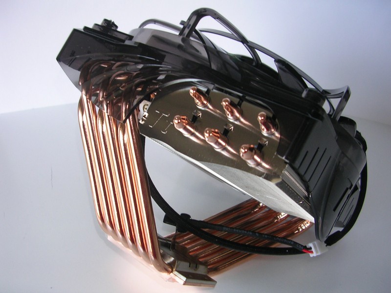 Dalla base si dipartono 6 heatpipes in rame da 6mm di diametro che, attraversando tutta la base e tornando poi dalla parte opposta al corpo in alluminio, funzionano in effetti come 12 heatpipes. Agli estremi poi attraversano le alette in alluminio in modo da convogliare omogeneamente tutto il calore asportato dalla base.