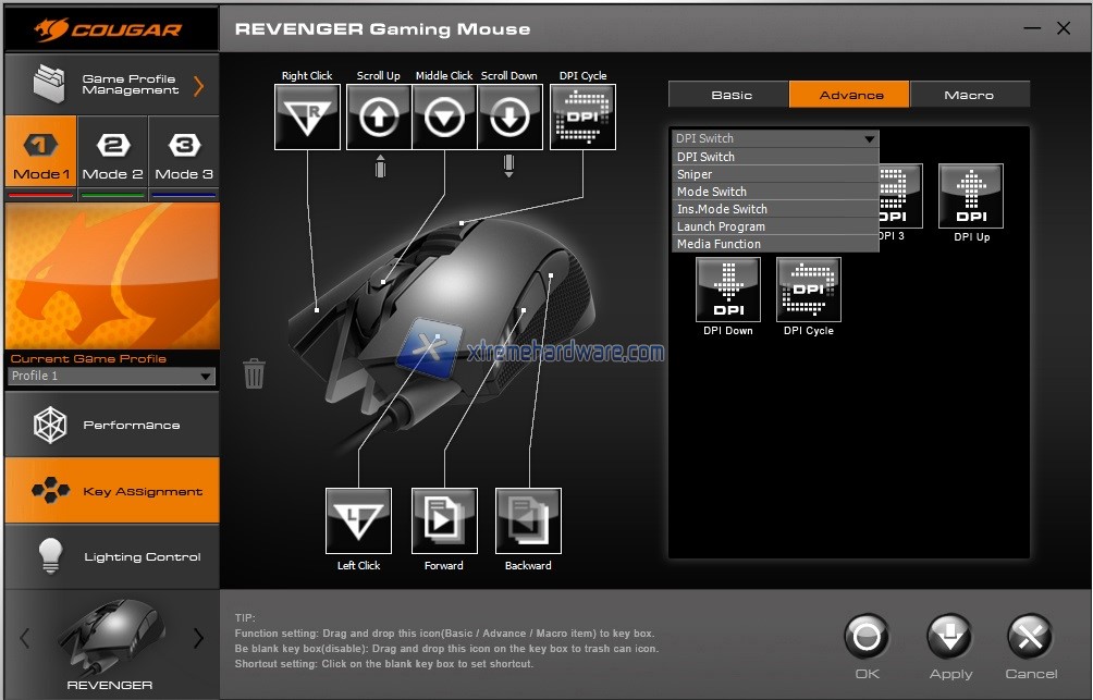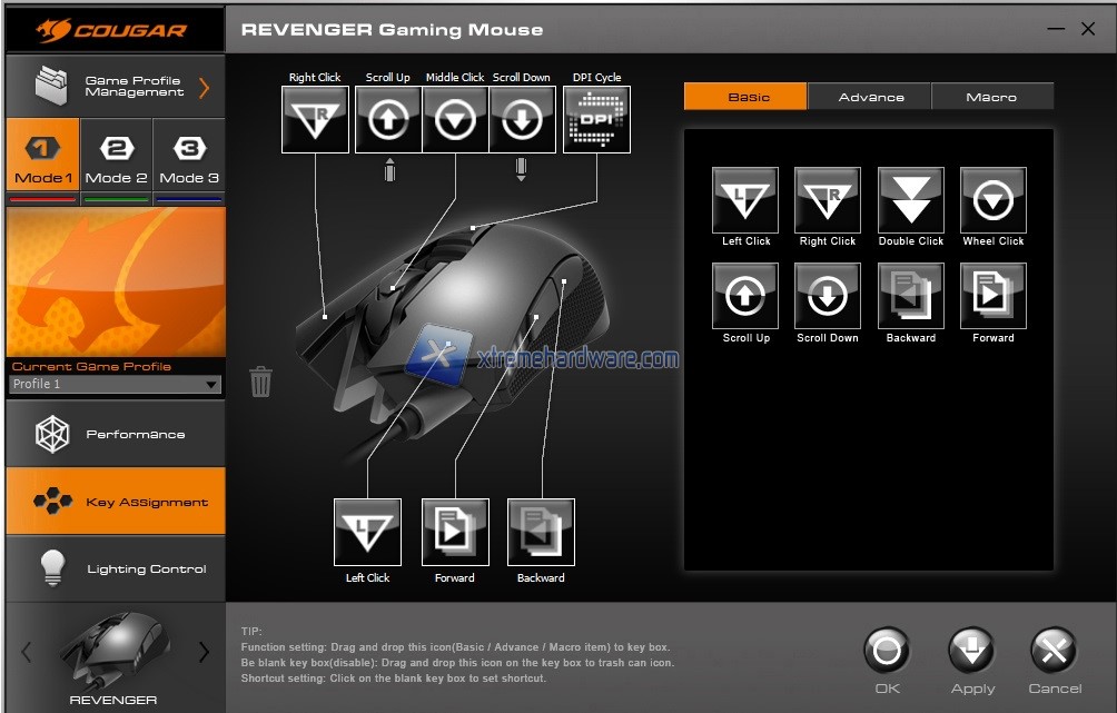 In ‘’Key Assignment’’ potremo come suggerisce e farà intendere la voce personalizzare la funzione di un dato tasto sul mouse. Troveremo a lato un ulteriore tabella con tre Menù principali più uno a tendina in Advanced che ci permetterà di scegliere quale funzione o impostazione ‘’importare’’ per il cambio funzione. Scelta la funzione ci basterà fare un Drag and Drop nella casella e fare Apply come visto per la tastiera. In questo modo avremo confermato il cambio. Nel caso non volessimo più tale funzione ci basterà fare un Drag and Drop dell’icona della funzione nel cestino.