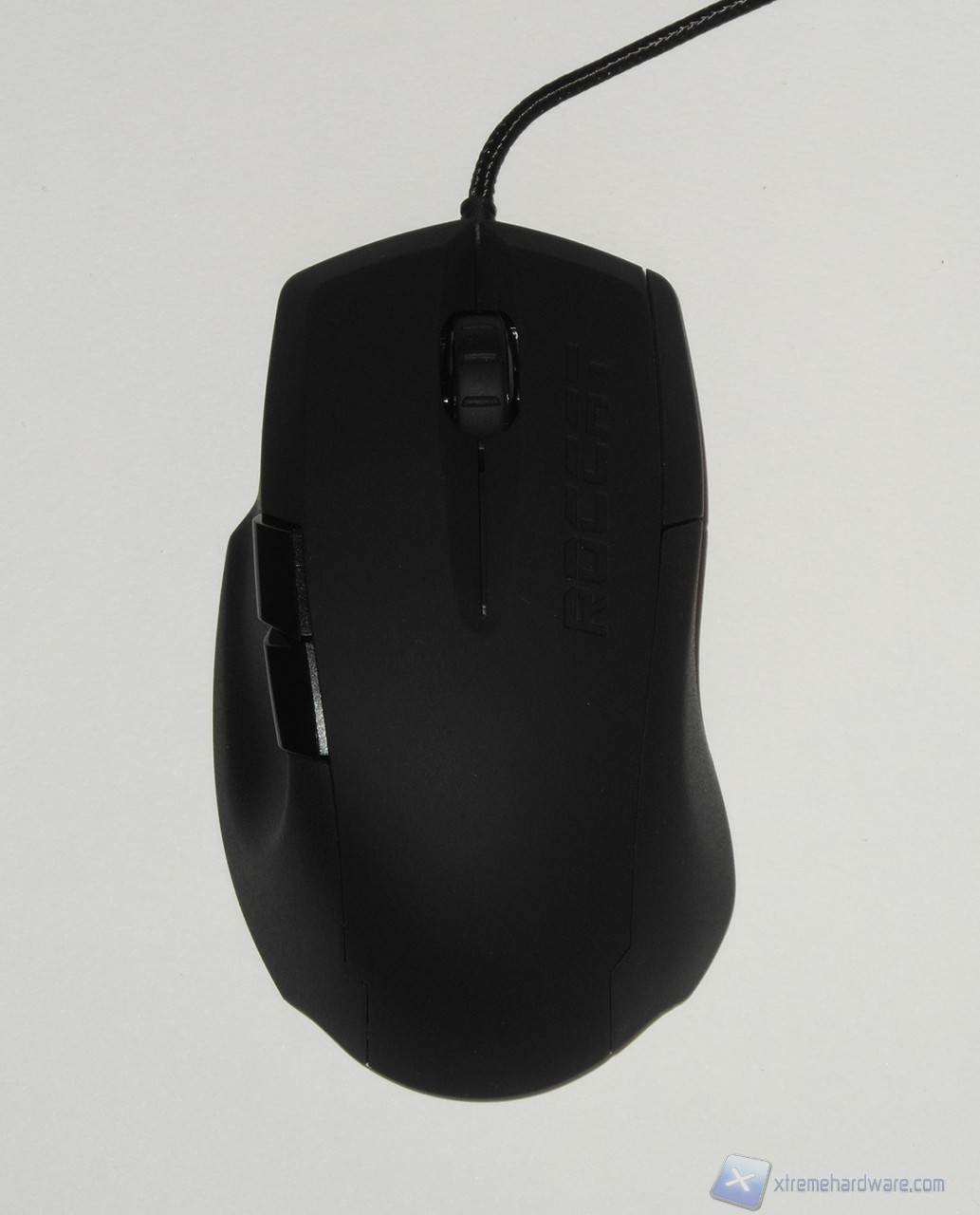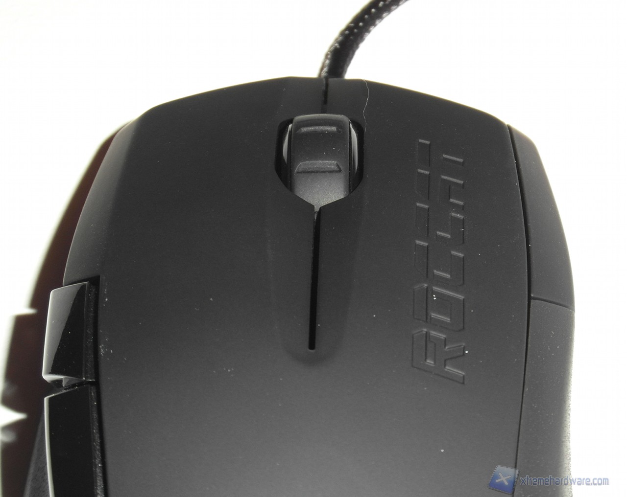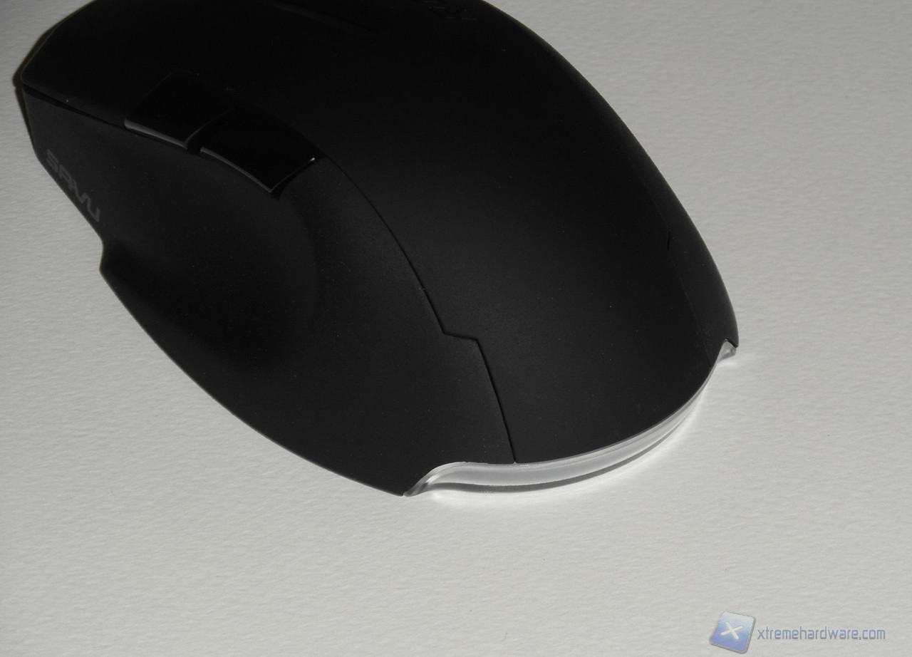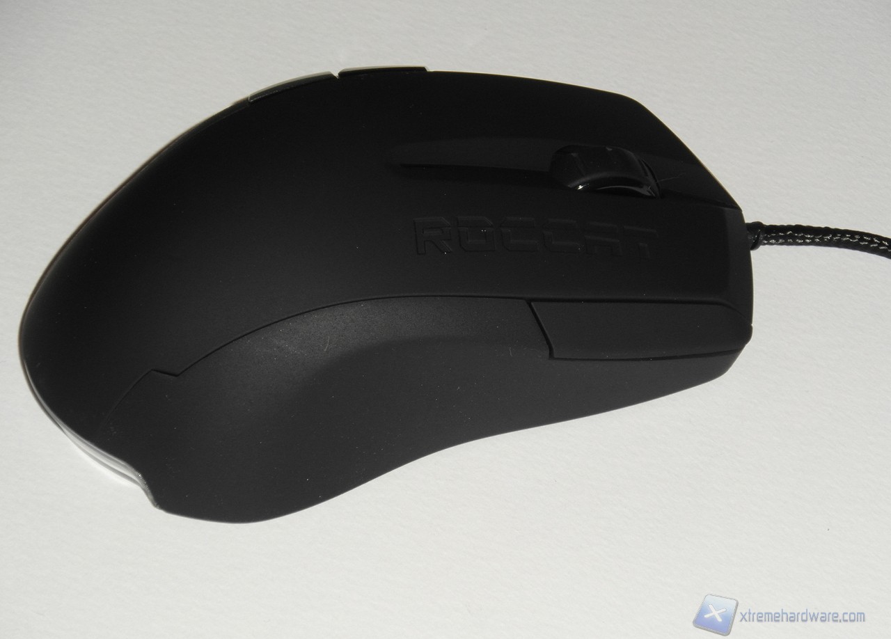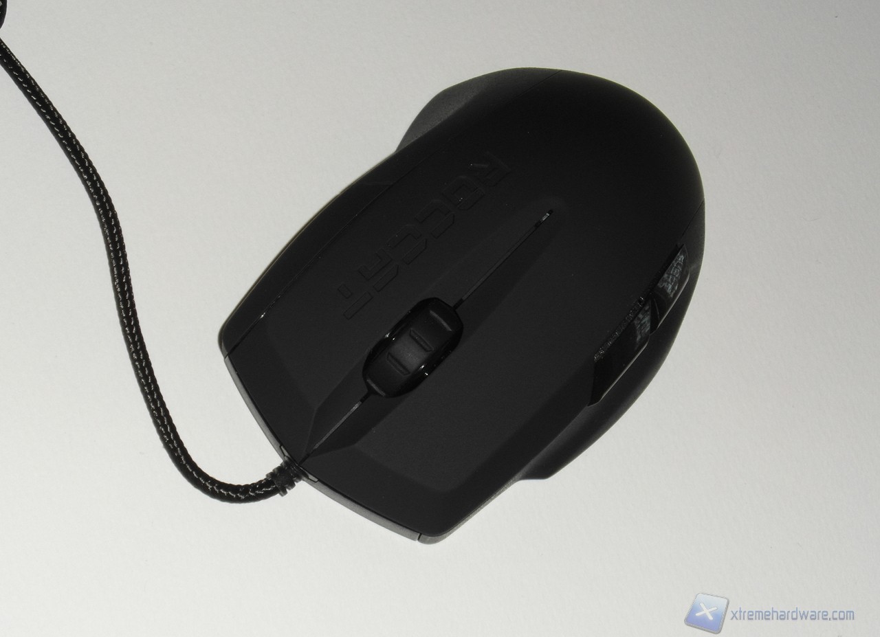 Nella parte superiore, più specificatamente sul tasto destro principale, è serigrafato il marchio Roccat; mentre al centro troviamo il canonico scroll, gommato e di buone dimensioni, caratterizzato da un profilo dentellato che dà un buon feedback al tatto.