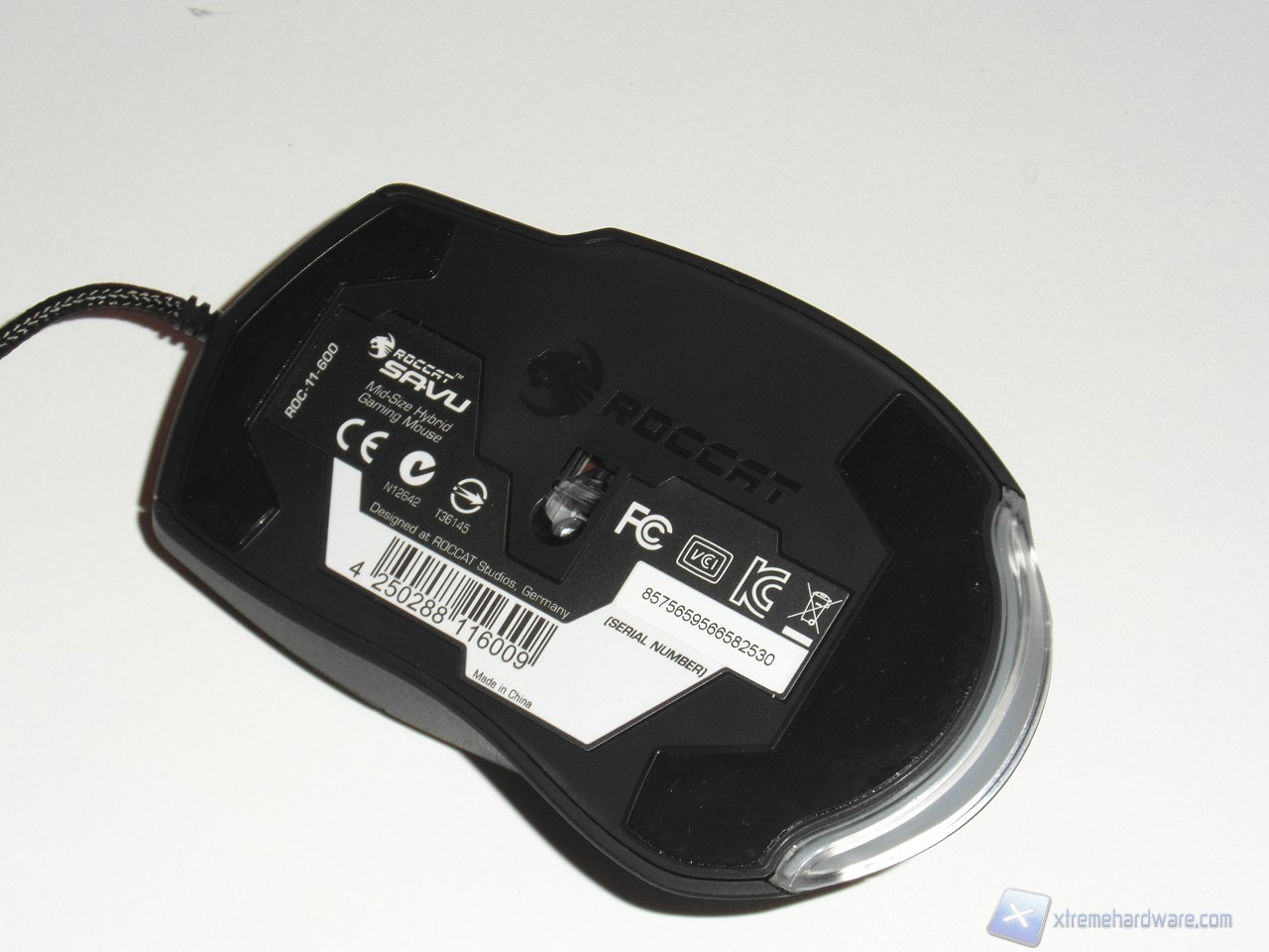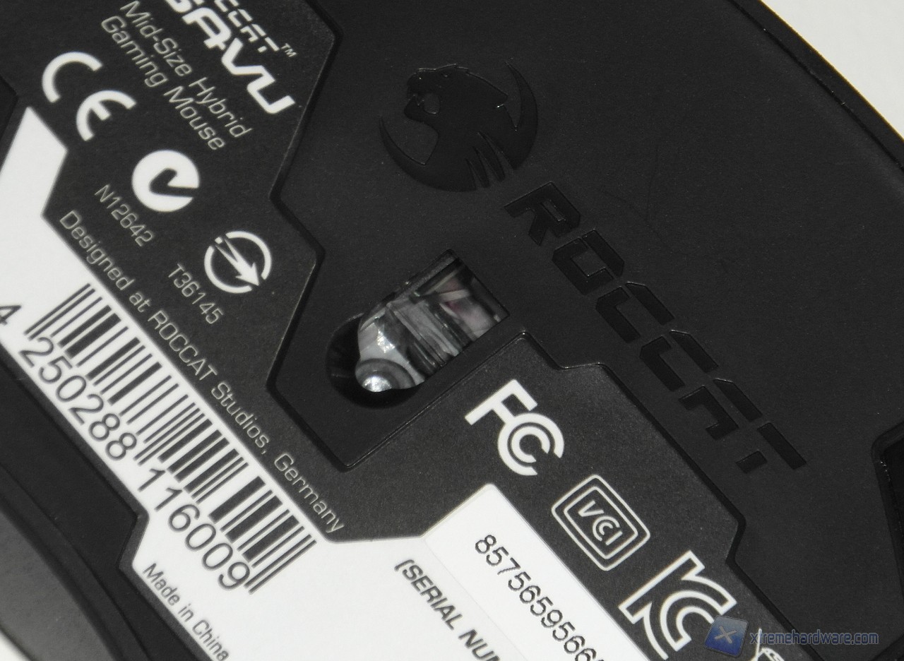 La parte inferiore del Roccat Savu è semplice, al centro troviamo il sensore ottico da 4000 dpi (Avago ADNS 3090), mentre grossi mousefeet in teflon assicurano un'ottima scorrevolezza del mouse.