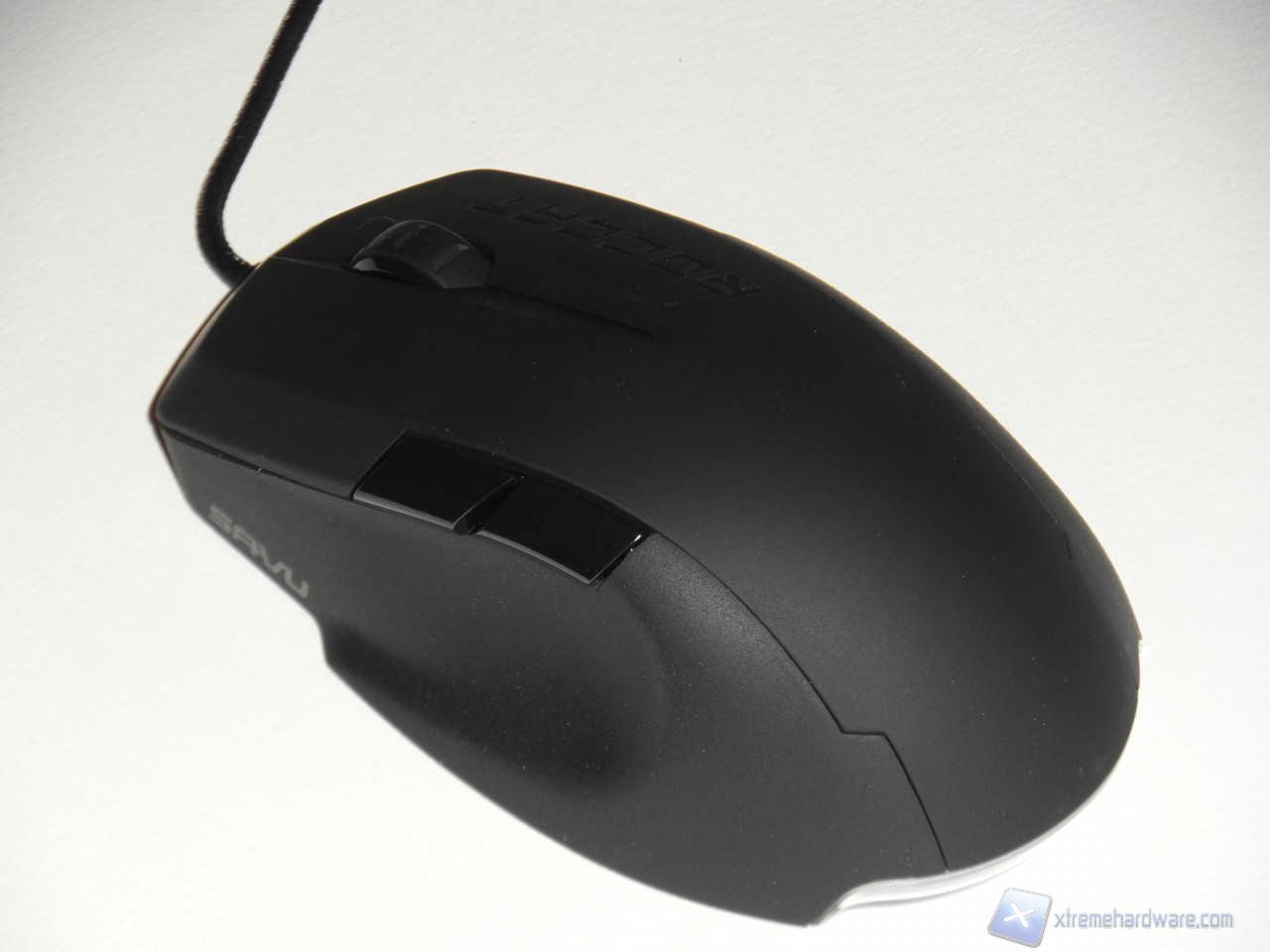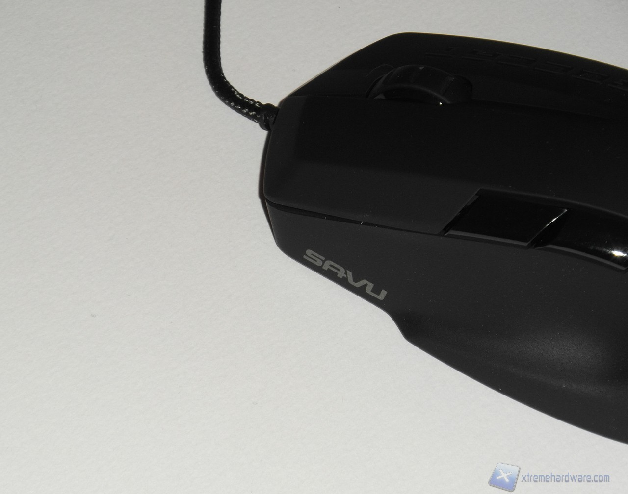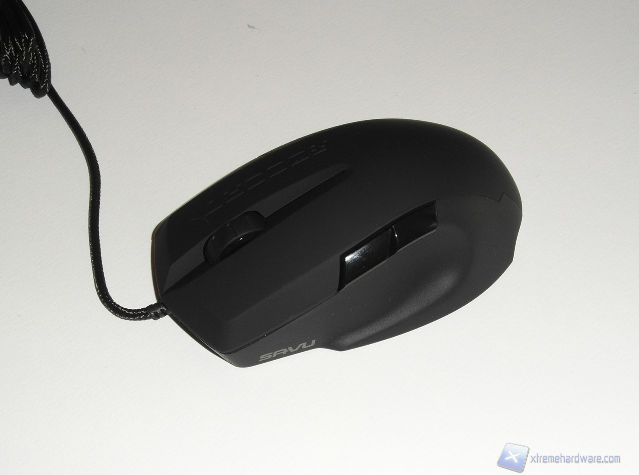 Esaminando dall'alto il Savu, notiamo il profilo asimmetrico, con impugnatura per destrorsi, che lo caratterizza. Nella parte superiore troviamo utilizzata la plastica soft touch (o plastica gommata) che ricopre il mouse nelle parti a contatto con il dito indice, medio e con il palmo della mano. Lateralmente il mouse è trattato in modo differente, un trattamento bucciato fine rende ruvido il mouse nelle aree di contatto con il pollice e l'anulare/mignolo, garantendo un ottimo grip delle dita.